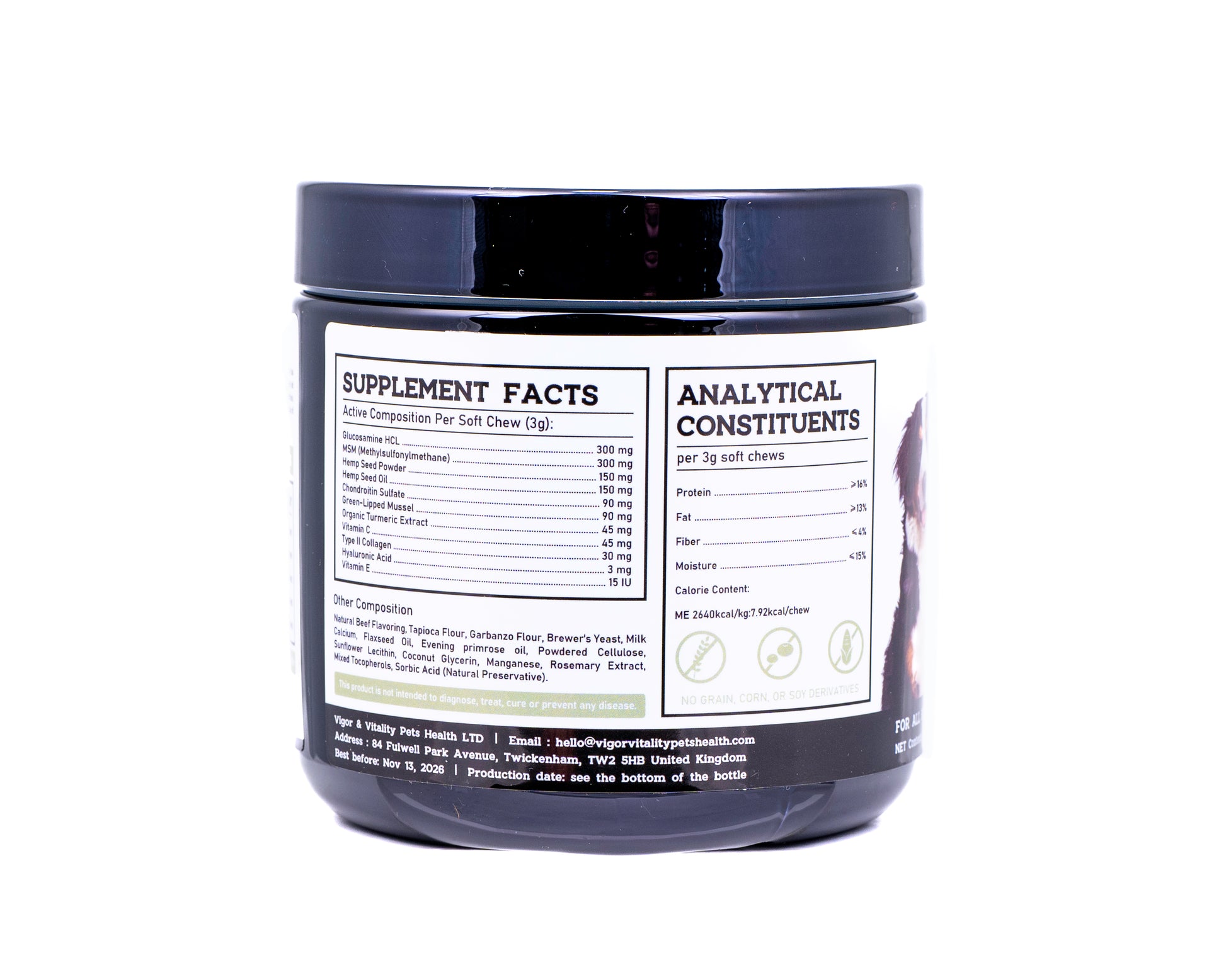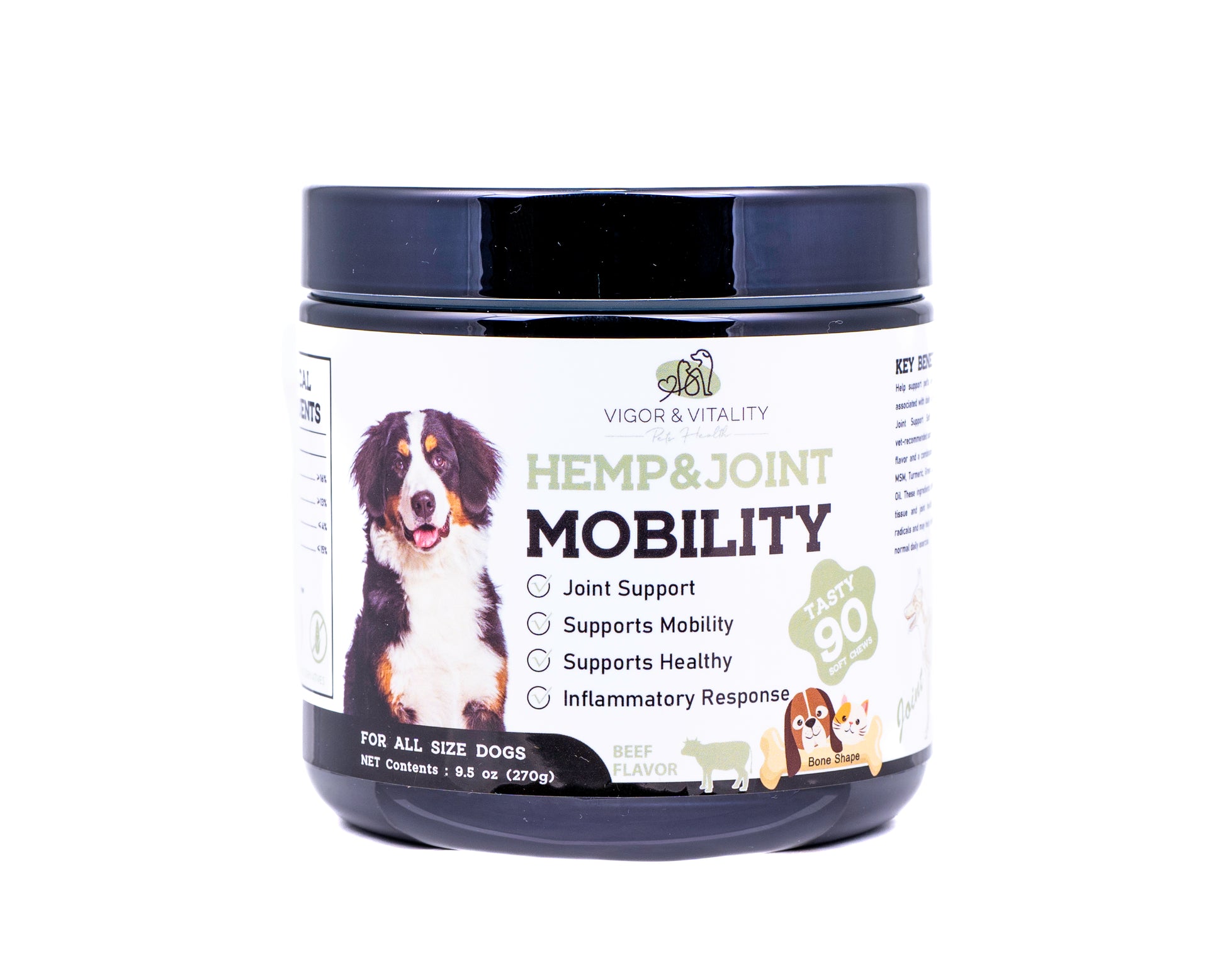 Introducing Vigor & Vitality Pets Health - your pet's ultimate source of Advanced Hemp & Joint Care in the form of Extra Strength Supplements, presented in a delicious Beef Flavour with 90 Chews per bottle. Containing 100% Natural Ingredients such as Glucosamine, Chondroitin & Green Lipped Mussel, Elevate your pet's well-being with Vigor & Vitality Pets Health Advanced Hemp & Joint Care. Give them the gift of mobility, comfort, and a happy, active life. After all, a healthy pet is a happy pet!