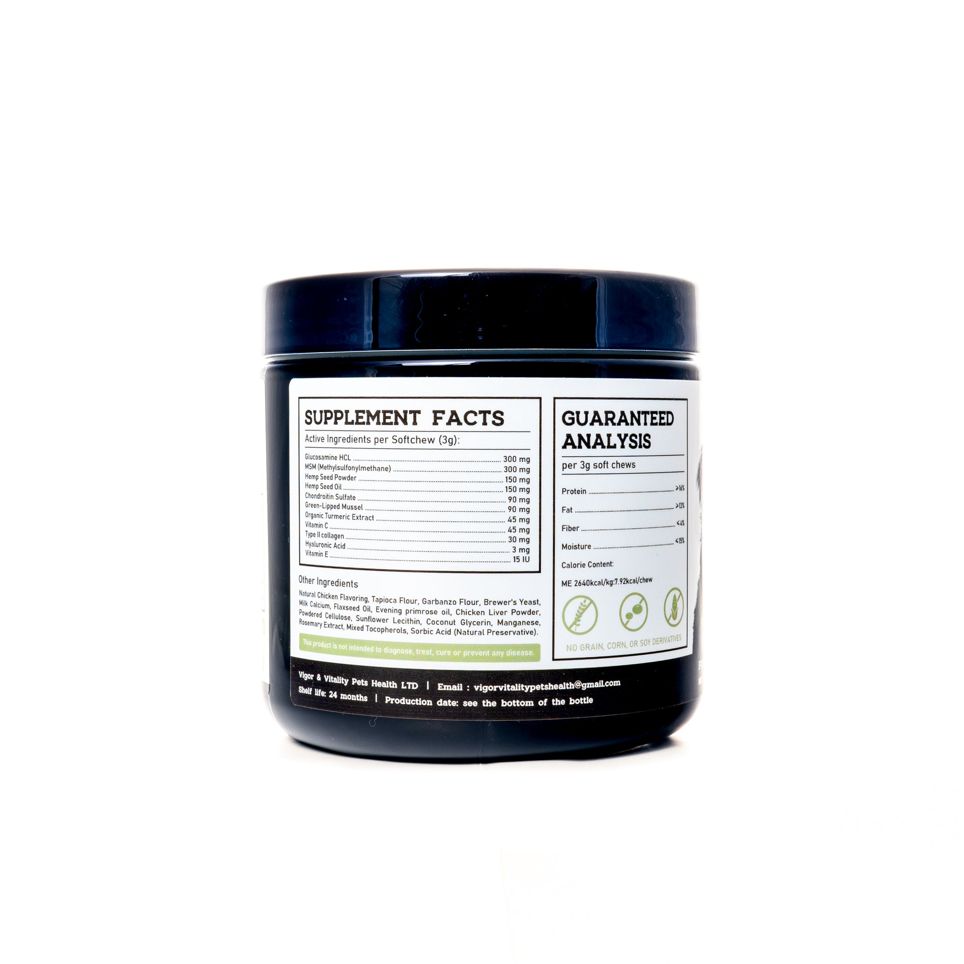 Introducing Vigor & Vitality Pets Health - your pet's ultimate source of Advanced Hemp & Joint Care in the form of Extra Strength Supplements, presented in a delicious Chicken Flavour with 90 Chews per bottle. Containing 100% Natural Ingredients such as Glucosamine, Chondroitin & Green Lipped Mussel, Elevate your pet's well-being with Vigor & Vitality Pets Health Advanced Hemp & Joint Care. Give them the gift of mobility, comfort, and a happy, active life. After all, a healthy pet is a happy pet!