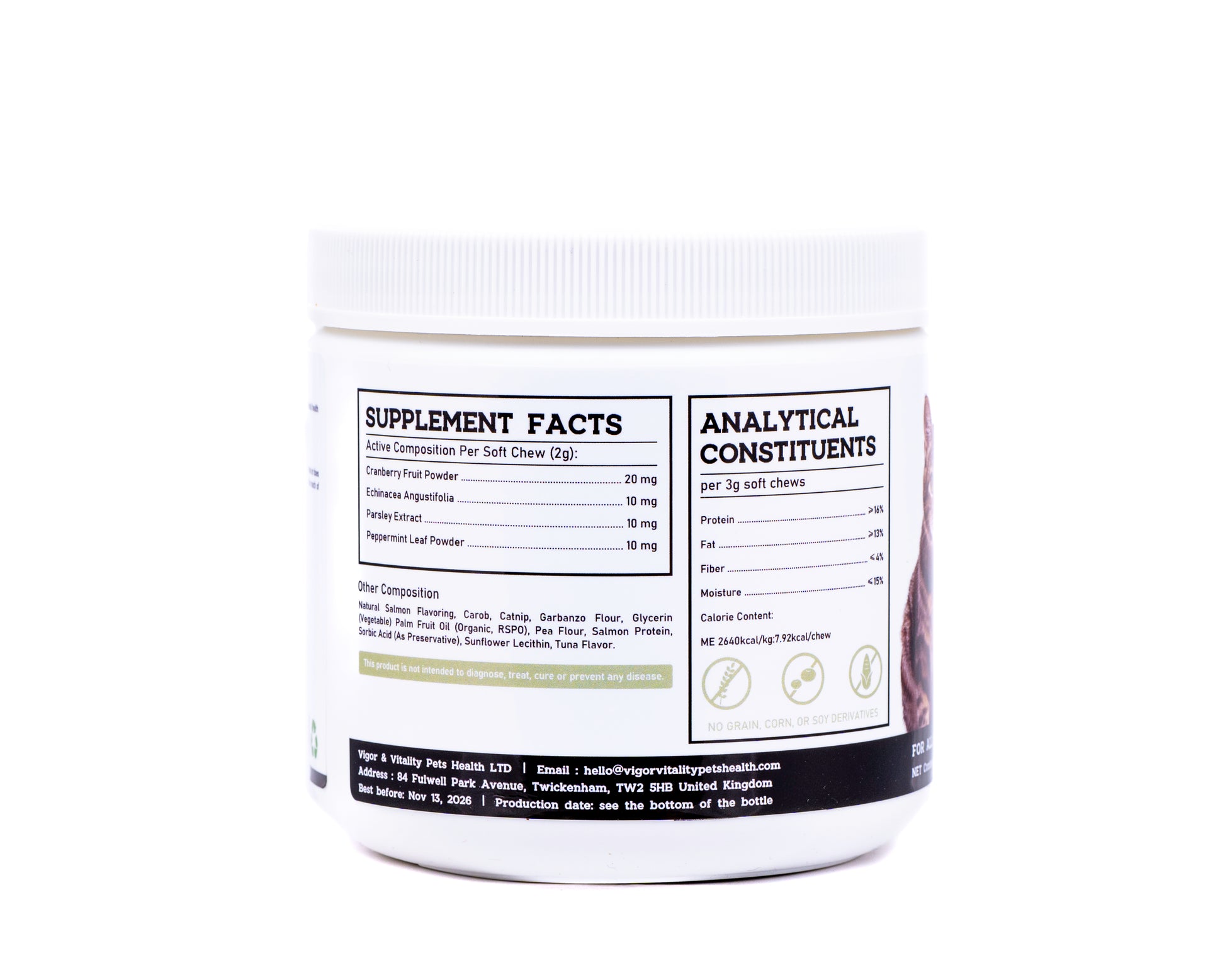 Cranberry Fruit Powder, Echinacea Angustifolia, Parsley Extract, Peppermint Leaf Powder Other Ingredients: Carob, Catnip, Garbanzo Flour, Glycerin (Vegetable) Palm Fruit Oil (Organic, RSPO), Pea Flour, Salmon Protein, Sorbic Acid (As Preservative), Sunflower Lecithin, Salmon Flavor.