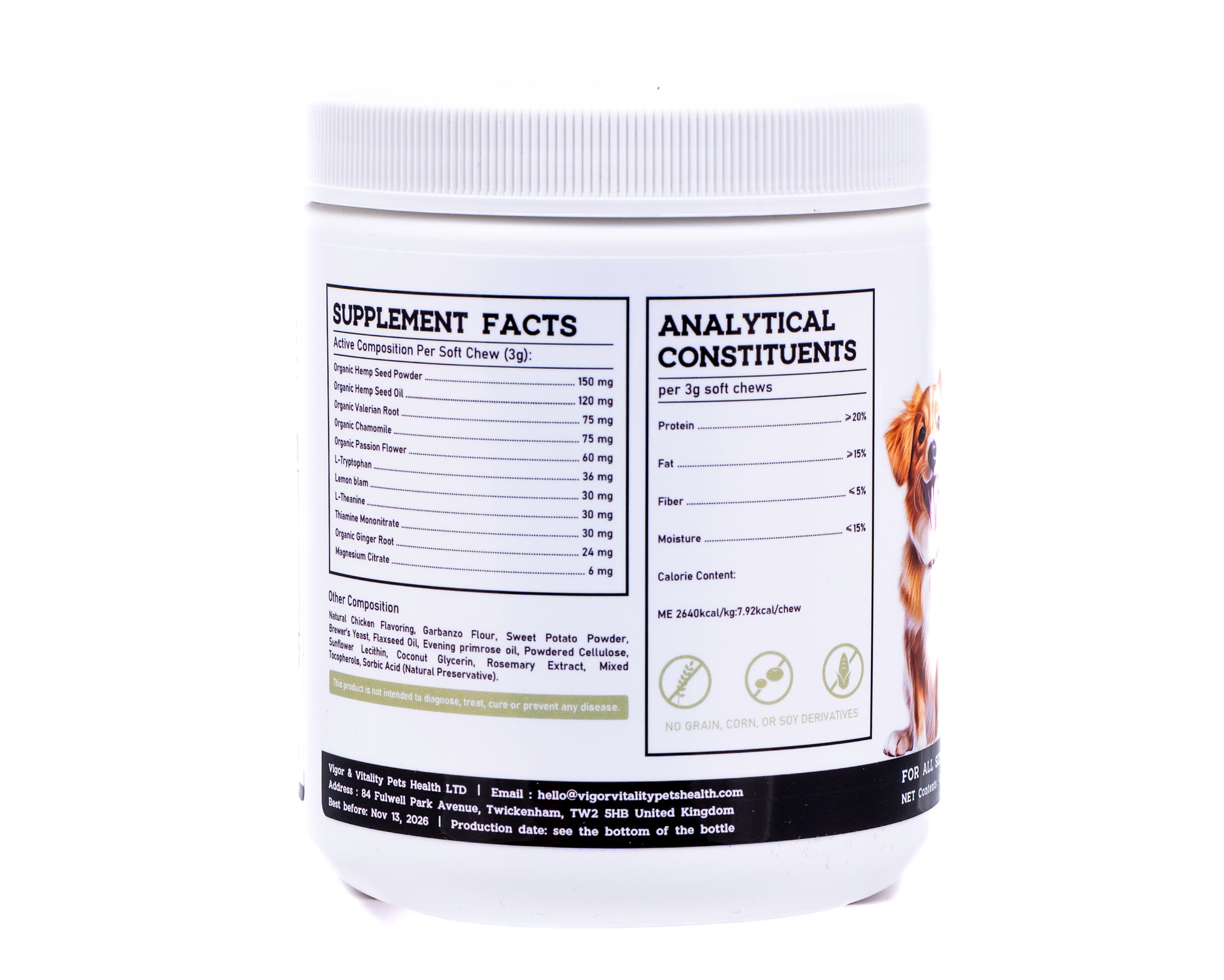 Whether you have a small, medium, or large breed, our calming chews are suitable for dogs of all ages. Give your pet the comfort they deserve with Vigor & Vitality Pets Health Calming Chews—because a calm dog is a happy dog!