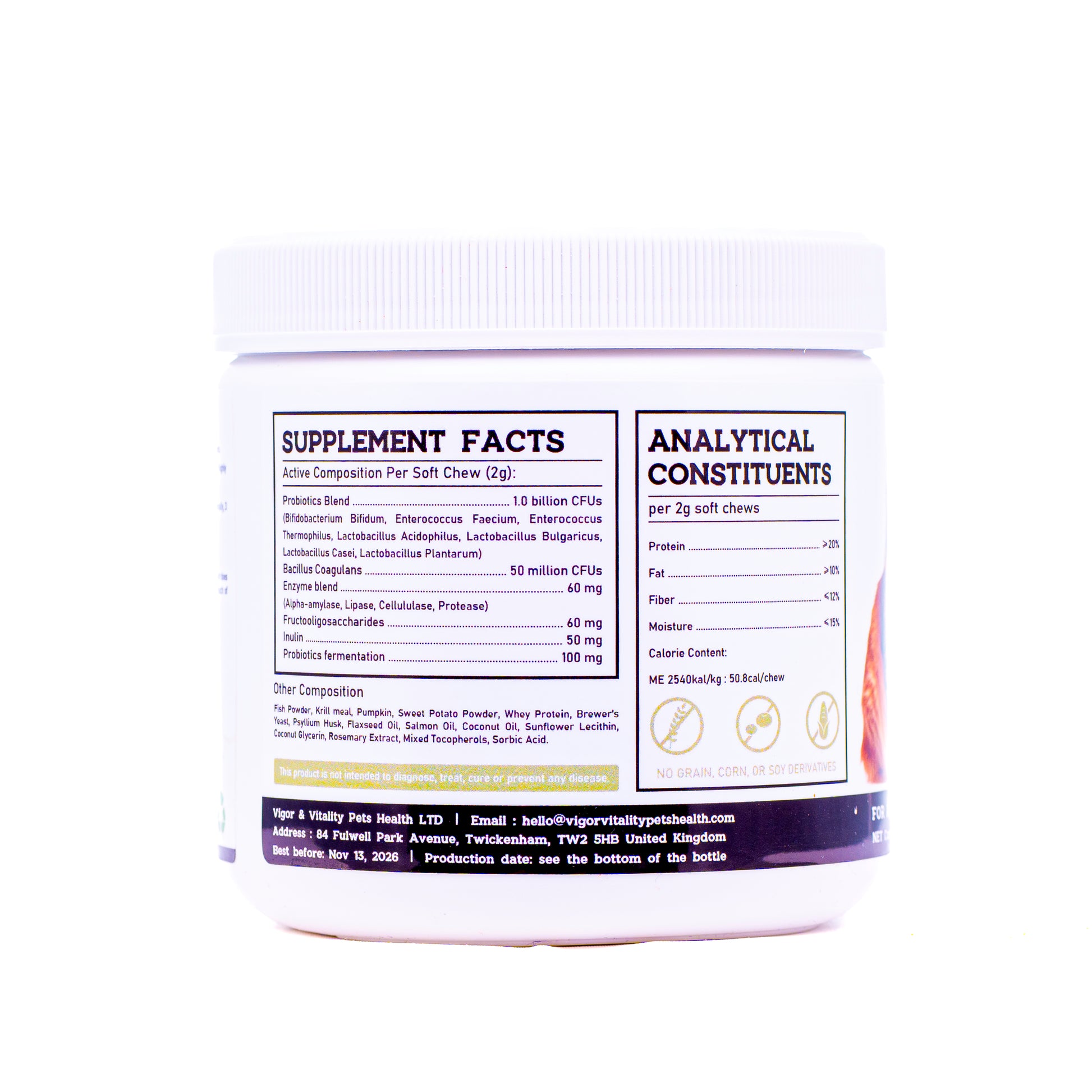Probiotic Blend, Bacillus Coagulans, Enzyme Blend, Fructooligosaccharides, Inulin, Probiotics fermentation, Pea Protein, Kelp meal, Pumpkin, Sweet Potato Powder, Whey Protein, Brewer’s Yeast, Psyllium Husk Powder, Flaxseed Oil, Salmon Oil, Coconut Oil, Sunflower Lecithin, Glycerin, Rosemary Extract, Mixed Tocopherols, Sorbic Acid
